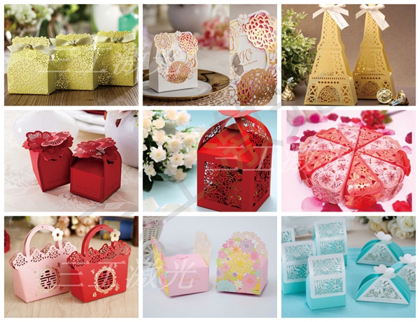紙品激光鏤空機雕刻喜糖盒、立體賀卡最新樣品