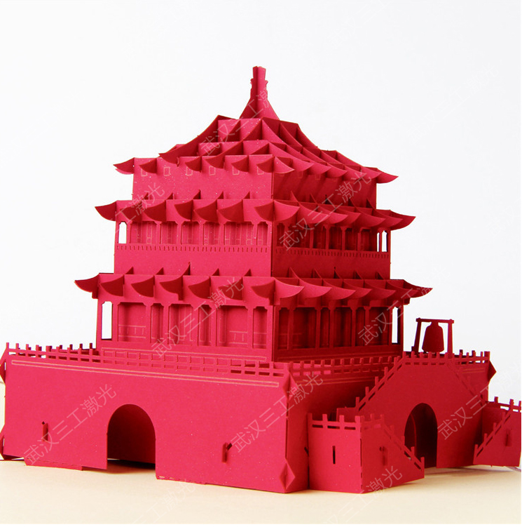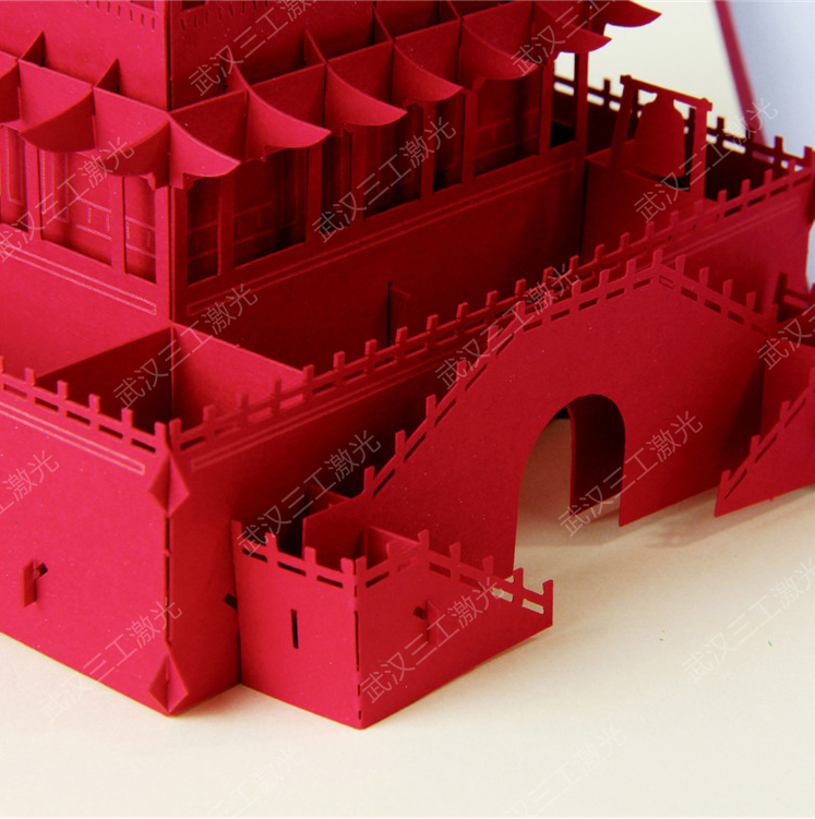 傳統(tǒng)的印刷加工行業(yè)對紙張形狀以及圖案的切割多采用機械模切的形式,這類的機器在加工不同圖案的紙制品時主要是通過制作不同的刀模來實現(xiàn)圖形的切割。這種加工方式的弊端就是制作刀模成本高,耗時長,并且對于復雜的圖形切割在很大的局限性,刀模的切割會引起機械變形,精準度不高,尤其是對于一些對精度要求較高的產(chǎn)品,則不能很好的進行生產(chǎn)加工。以紙質(zhì)建筑模型拼圖為例,細微的差別都會影響模型的拼插和美觀度,而激光對紙張進行鏤空切割,則是無接觸式加工,會嚴格按照設計好的圖形路徑進行加工,重復定位精度可達0.01mm,除了在保障精度的同時,其速度可達7000mm/s,并且在不同的圖形加工過程中省去了制作刀模的過程,有效降低了生產(chǎn)成本。下面一起來看一組激光切鏤空的紙質(zhì)建筑模型樣品圖吧!