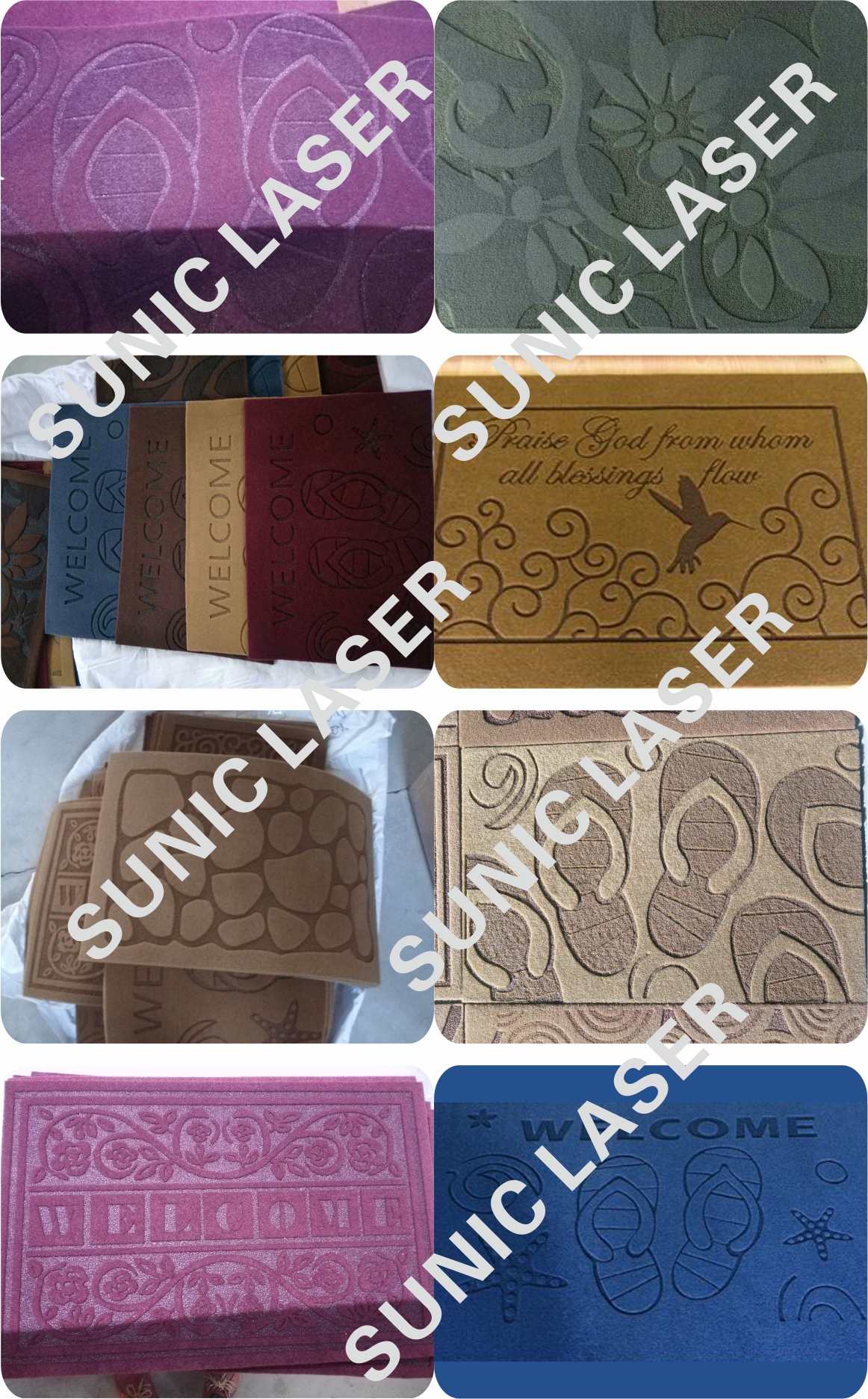 相對(duì)于傳統(tǒng)切割方式,激光雕刻毯速度快,配合送料裝置可以一次切整卷地毯,精度高,可以自動(dòng)收邊,圖形不受限制,尤其適合異型,個(gè)性化圖形的切割,雕花,拼花??梢岳秒娔X進(jìn)行自動(dòng)排版,節(jié)省材料和人工費(fèi)用。適用于無(wú)紡、丙綸、混紡、復(fù)合人造皮各種地毯材料。各種幅面地毯,門前毯,汽車飛機(jī)地毯,片毯,手工毯,方塊毯,長(zhǎng)廊毯,LOGO毯,背膠地毯,長(zhǎng)毛毯等切割、雕花、拼花,也適合人工草坪切割。