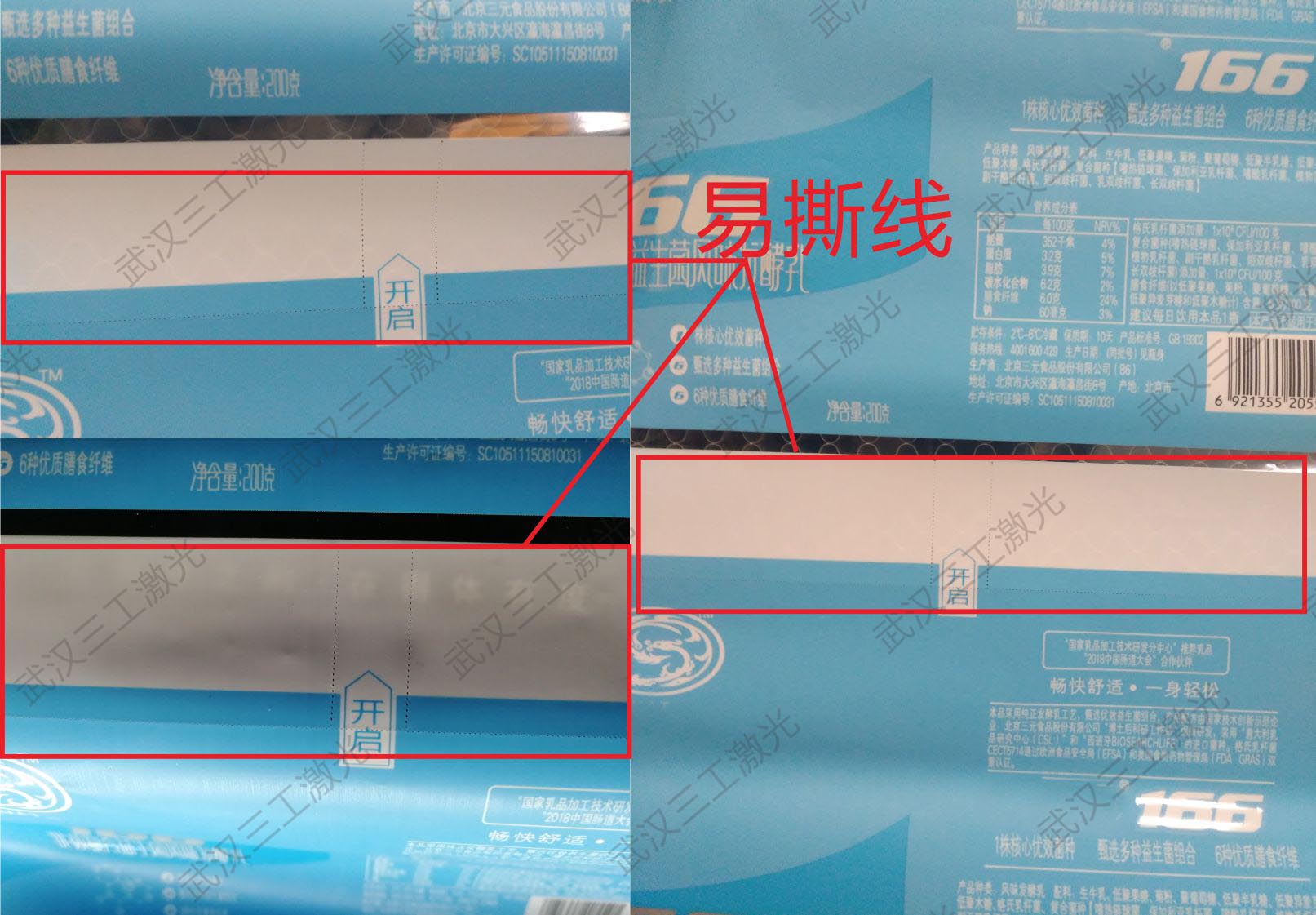 隨著人們的生活水平的不斷提高,人們在實(shí)際生活當(dāng)中會碰到如:糖果的包裝袋、方便面的包裝袋、小零食包裝袋。在使用時(shí)很不方便,很難打開,雖然人們在包裝袋上打出鋸齒形或在旁邊開口等多種方法,但是當(dāng)人們手很濕時(shí),又找不到剪刀之類的工具,這時(shí)就很打開,有的人干脆就用牙齒去咬,這樣給人們帶來了很大的不方便. 鑒于上述存在的問題,三工激光研發(fā)出易撕線激光打標(biāo)機(jī),用激光打出來的易撕線,讓包裝袋好撕,并且撕得整齊。