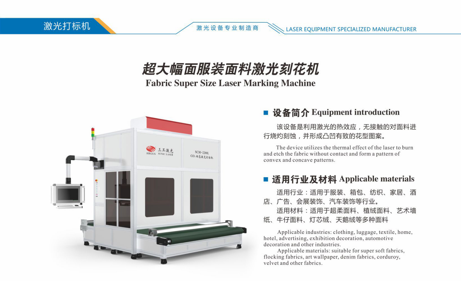 服裝面料激光刻花機該設(shè)備是利用激光的熱效應(yīng),無接觸的對面料進(jìn)行燒灼刻蝕,并形成凸凹有致的花型圖案。適用于服裝、箱包、紡織、家居、酒店、廣告、會展裝飾、汽車裝飾等行業(yè)。