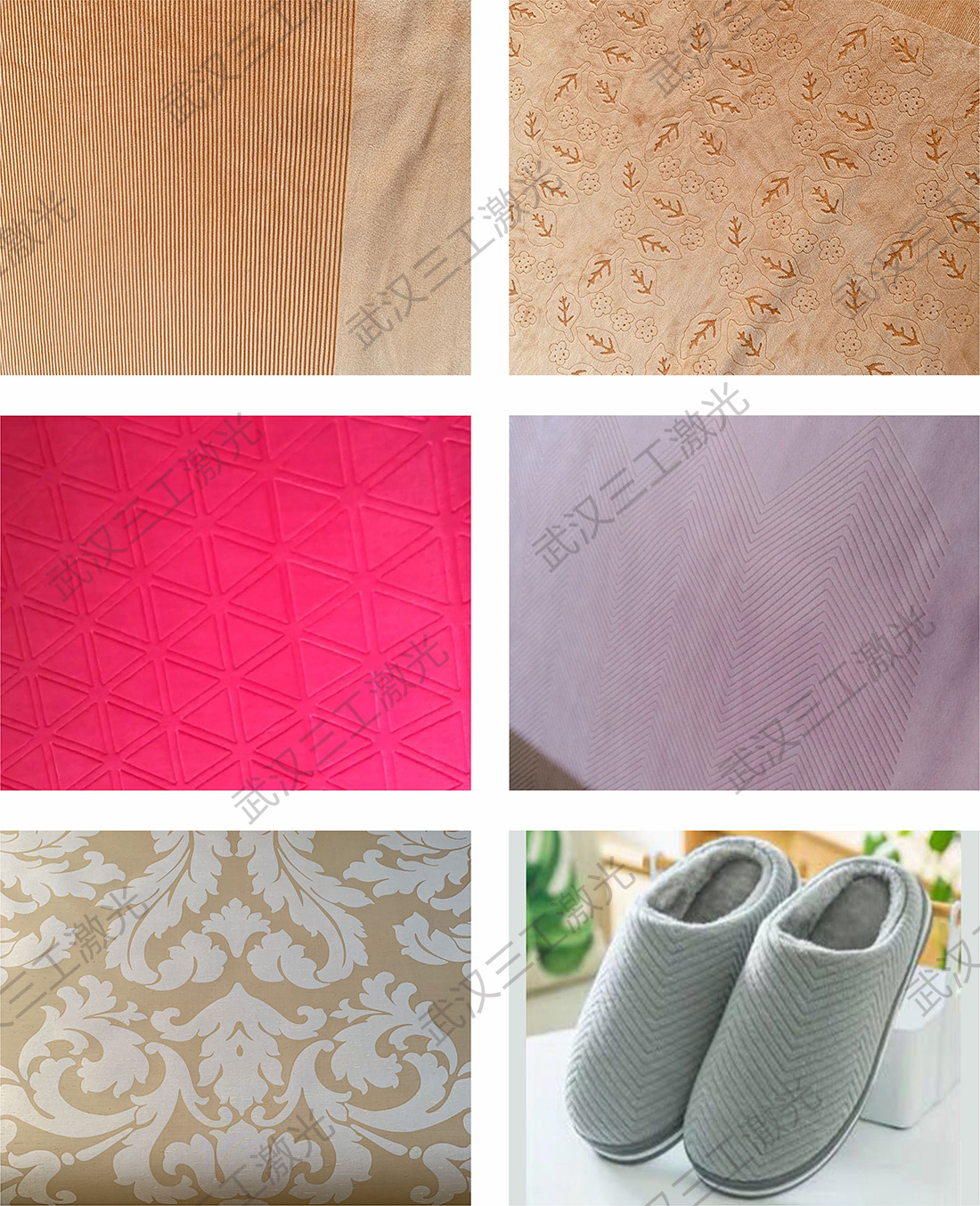 該設(shè)備是利用激光的熱效應(yīng),無接觸的對面料進行燒灼刻蝕,并形成凸凹有致的花型圖案。適用于服裝、箱包、紡織、家居、酒店、廣告、會展裝飾、汽車裝飾等行業(yè)。適用于超柔面料、植絨面料、藝術(shù)墻紙、牛仔面料、燈芯絨、天鵝絨等多種面料。