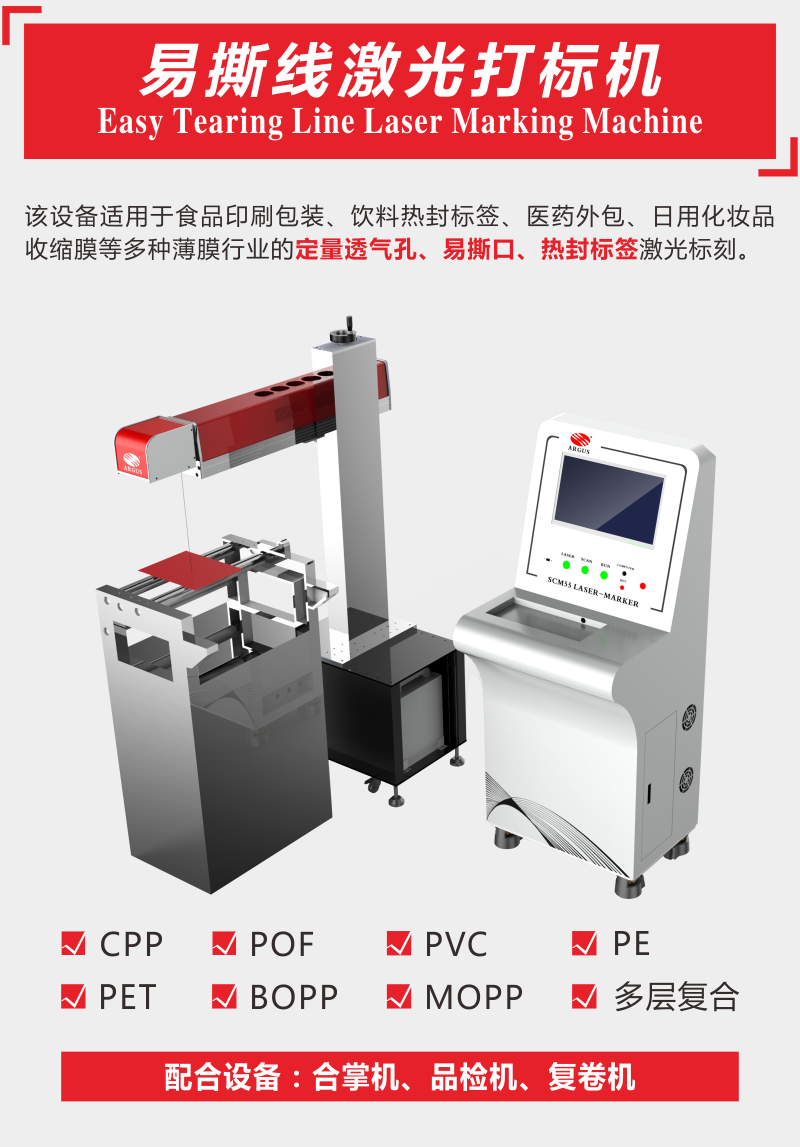 激光加工技術(shù)的應(yīng)用越來越廣泛,目前我公司針對塑料薄膜包裝易撕線運用激光加工。易撕線激光切割機,可以加工的材料以及行業(yè)非常廣泛,可用于PE、PVC、PET、OPP、塑料、鋁箔 、防靜電/屏蔽袋、抽真空袋、鋁箔面膜、寵物雜糧袋、塑料粒紙鋁塑復(fù)合袋、微孔紋真空袋、建材包裝袋、防潮袋、封口膜等包裝材料的易撕線易撕口的加工,專業(yè)易撕線激光劃線設(shè)備,專為薄膜包裝行業(yè)而生。除此之外還可進行熱封標簽透氣孔,定量透氣孔的加工!