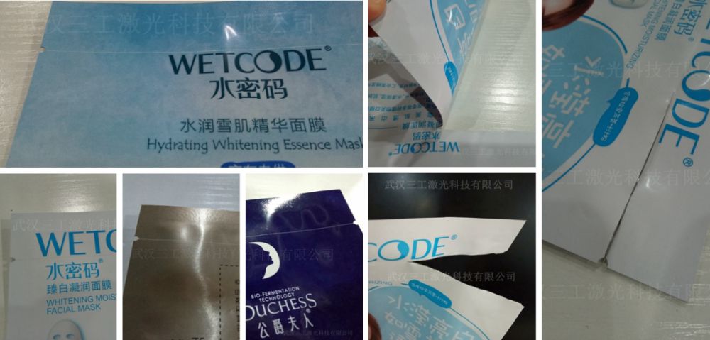 以下是三工激光根據(jù)不同品牌的面膜袋打樣的成品以及撕開效果圖: