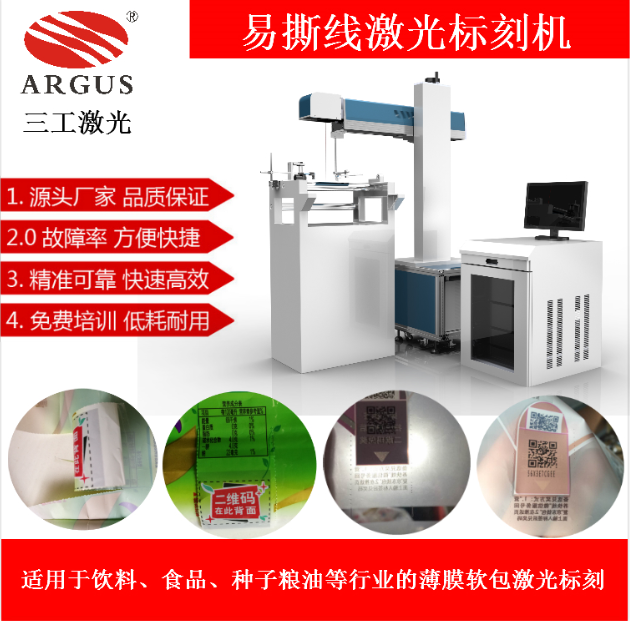 使用激光設(shè)備來改進包裝袋的易撕口工藝,是由三工激光率先提出并且已成功運用在很多包裝袋生產(chǎn)廠家。激光標(biāo)刻易撕口工藝用在面膜包裝袋上,主要體現(xiàn)在將易撕口改變成易撕線,激光在面膜包裝帶上打上一排微型的虛線孔,讓消費者能整齊而又方便的撕開面膜包裝袋。而且由于面膜包裝袋由多層復(fù)合材料組成,并且有密封和阻隔要求,激光標(biāo)刻機可以精準的控制激光打孔的深度從而只打半透的虛線孔,既保證了包裝袋的完成性又讓包裝袋美觀易撕。
